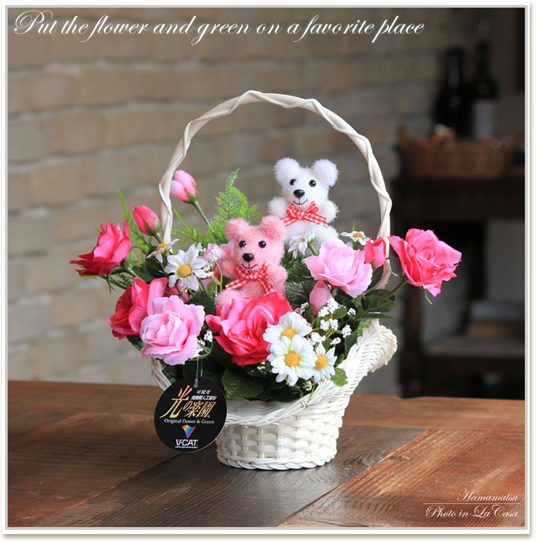[商品特徴] : 光触媒 スマイルベアーズ 造花約 幅32×奥行25×高さ27cm日本光触媒加工(V-CAT)バラ(薔薇・バラ・ばら)デージー 器:籠敬老の日、お中元、ご挨拶、お礼、誕生日、お祝い、結婚記念日、結婚祝い・・・・・・・・・・