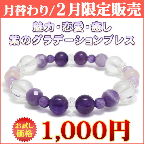 2月の月替わりは様々なアメジストを織り交ぜた、紫色のカラーリングをお楽しみ頂けるブレスレットです。ちょっぴり濃いめの紫色に、変化を添えるファントムアメジスト。透明な水晶から淡いラベンダー色へと続く、女・・・・・・・・・・